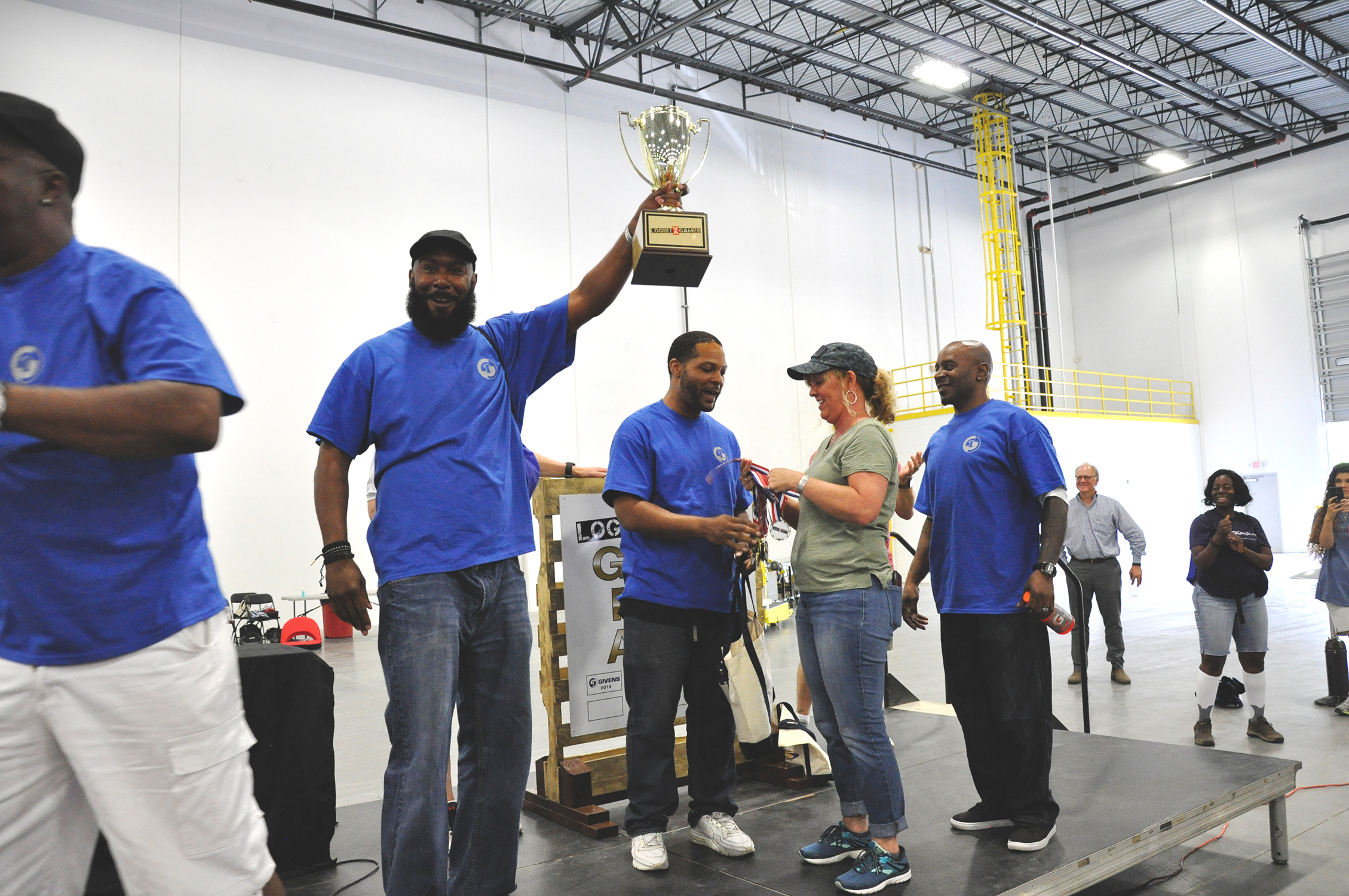 Teams participate in a timed pallet jack relay race through an obstacle course while keeping the boxes on the pallet.