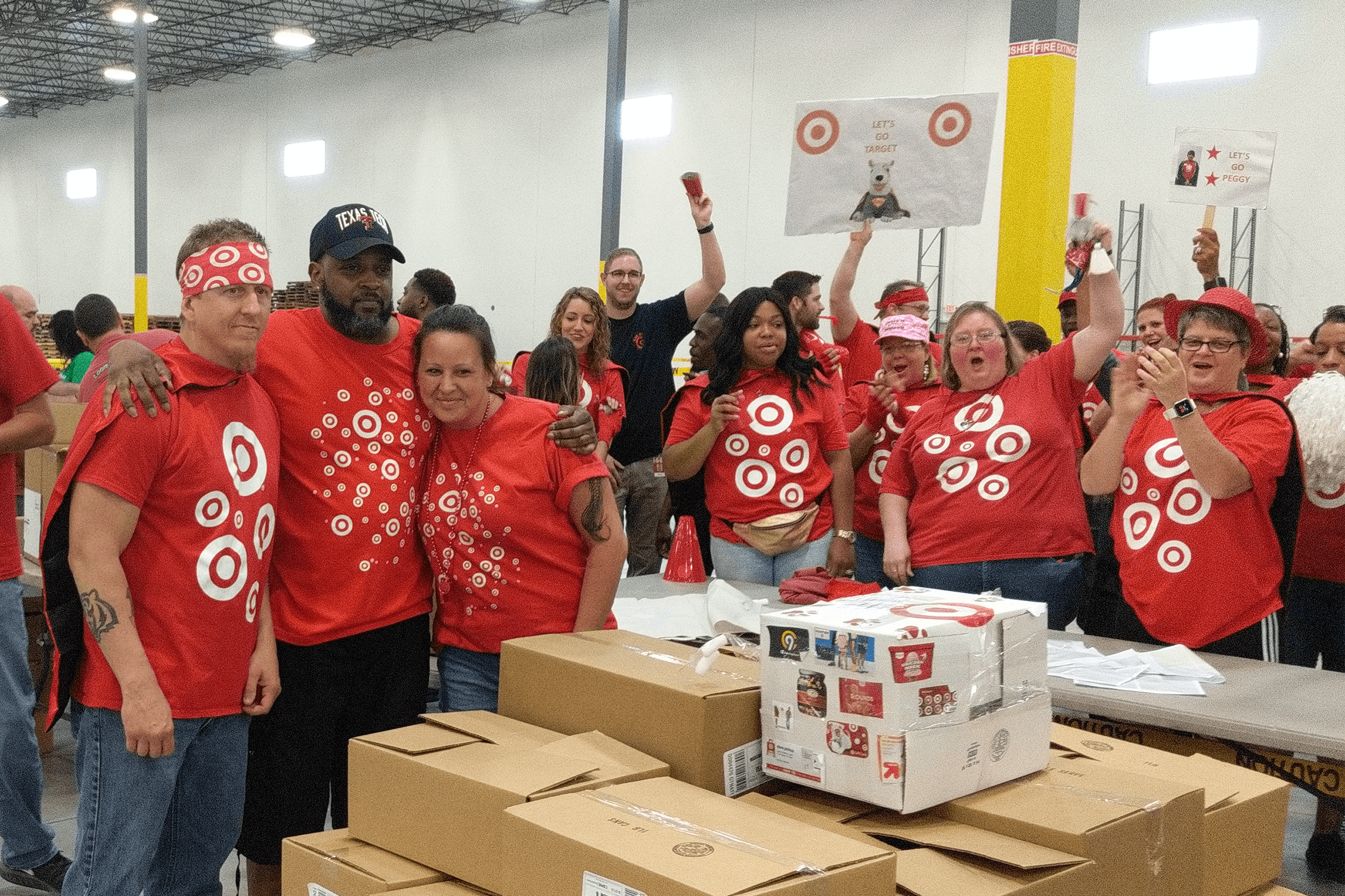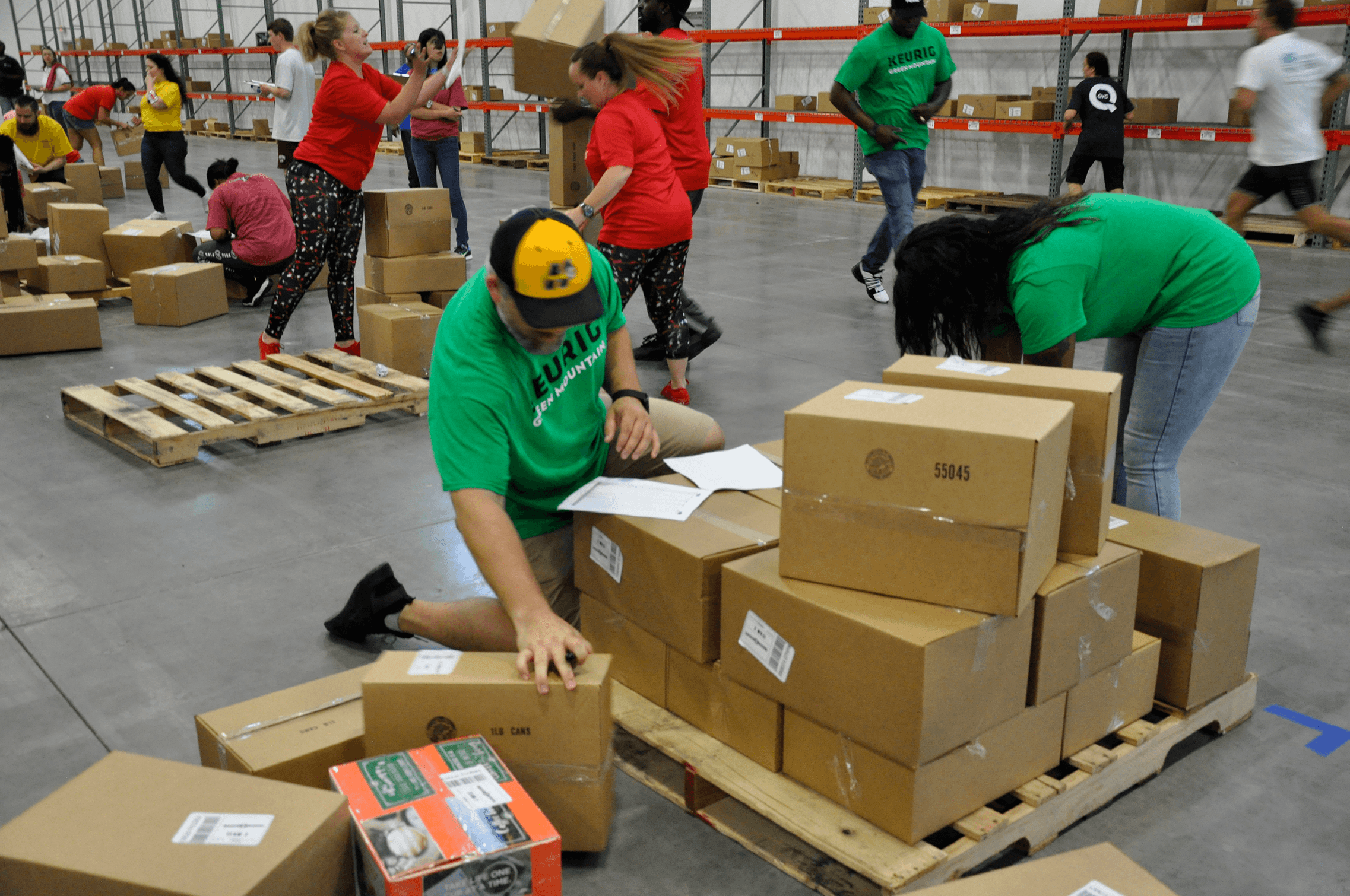 Teams move boxes from the pallet to a warehouse racking system while memorizing positioning and SKUs in a timed race.